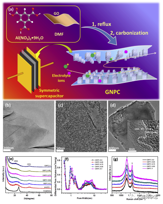 Figure 1. aGNPC对称超级电容器的制造示意图。(b)氧化石墨烯、(cGO-MOF配合物和(dGNPCTEM图像。插图:GNPCHRTEM图像。GNPC材料的(eXRD图、(f)孔径宽度分布和(g)拉曼光谱。