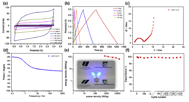 Figure 3. 基于GNPC-0.75的对称超级电容器在有机电解质中的电化学性能:基于GNPC-0.75材料的超级电容器设备的(aCV曲线、(bGCD曲线、(cNyquist图、(dBode图和(eRagone图。插图:由基于GNPC-0.75的超级电容器设备供电的两个2.7 V LED。(fGNPC-0.75材料的循环稳定性。
