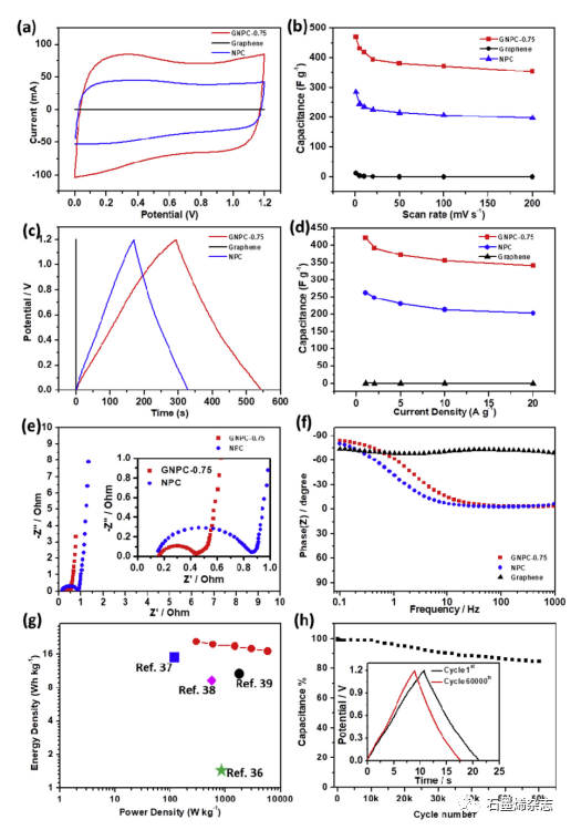 Figure 2. GNPC-0.75NPC和基于石墨烯的对称超级电容器在水性电解质中的电化学性能:(a-bCV曲线和基于CV测试的电容值。(c-d)恒电流充电/放电曲线和基于GCD测试的电容值。(eGNPC-0.75NPC的奈奎斯特图。插图:高频区域。(fGNPC-0.75NPC和石墨烯材料的波特图。(gGNPC-0.75样品的Ragone图。(hGNPC-0.75材料的循环稳定性。